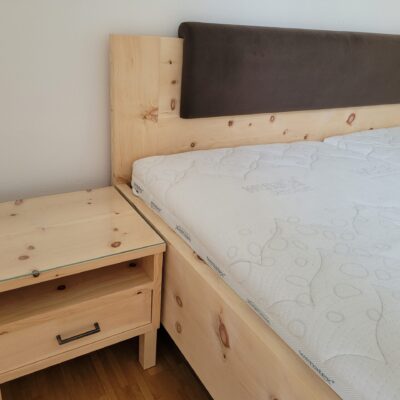 Ein hochwertiges Doppelbett aus massivem, naturbelassenem Zirbenholz, das für ein angenehmes Raumklima und den charakteristischen Duft der Zirbe sorgt. Zwei Nachtkästchen, jeweils mit einer praktischen Lade.