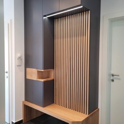 Moderne Garderobeneinrichtung mit dunklen, matten Oberflächen in Kombination mit senkrechten Holzlamellen, einer Sitzbank und offenen Ablageflächen aus geölter Eiche. Eine eingelassene LED-Leiste sorgt für dezente, indirekte Beleuchtung.